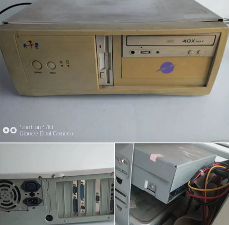 • 06-23古懂電腦主機-臺實物如圖。成色古懂什么都 不缺。現在通電開通看上去運轉正常。但是沒 有大頭顯示器了。不出亮。不知好壞。原機原 裝。